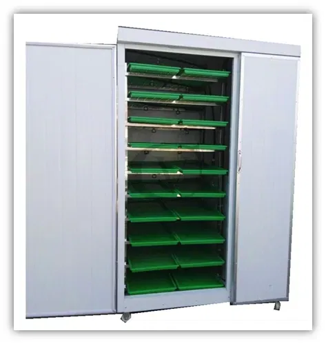 1000 lbs/day-Size 18'x8'x7'H (5000 lbs.)-10/90 trays/day-130 lbs seed+50 gals H2O/day